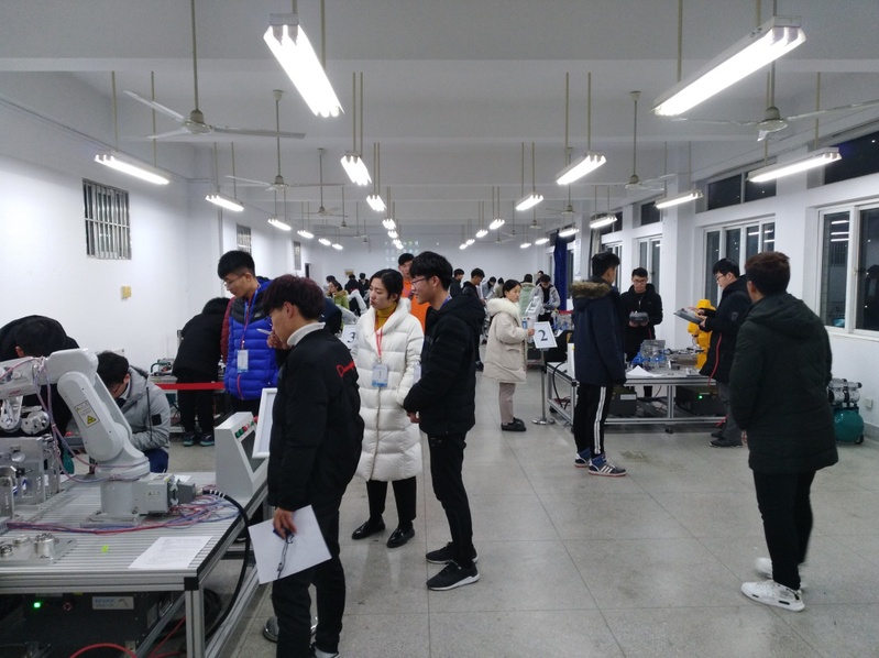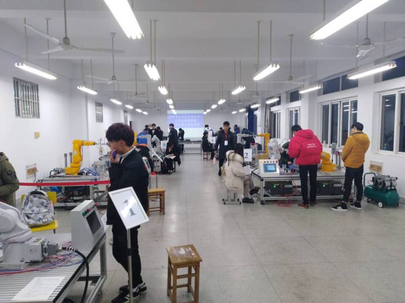 此次比赛内容为面向智能制造领域,利用工业机器人轴承自动装配单元,在1小时比赛时间内,通过机器人示教编程和自动运行,参赛队员和机器人协作完成轴承装配动作。经过4小时的紧张比赛,最终9支队伍获得一、二等奖并成功晋级首届安徽省大学生工业机器人应用大赛决赛,8支队伍荣获三等奖。