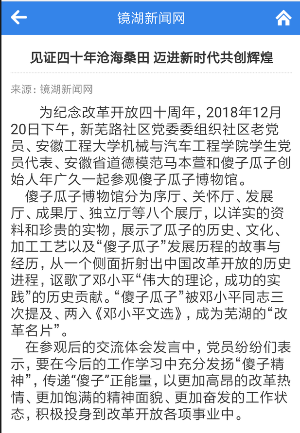 为隆重庆祝改革开放40周年,讴歌改革开放40周年所取得的伟大成就,12月20日,机制专业学生第一、第二党支部,材料专业学生党支部、车辆专业学生第二党支部,机电专业学生党支部,材料研究生党支部与镜湖区新芜路社区党组织共同参观傻子瓜子博物馆。