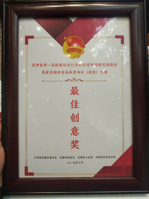 10月29日上午,由共青团芜湖市委联合芜湖市扶贫办、市人社局、市农业农村局共同举办的“芜湖市青春扶贫项目(创意)大赛颁奖活动”在芜湖苏宁环球大酒店举行。芜湖市市委副秘书长张敏、国家物联网基础标准工作组总体组组长沈杰及团市委、市扶贫办等举办单位相关负责人出席了本次活动。Bl小说 “含笑花”志愿者团队的《筑梦扶贫—高校废旧自行车回收再利用的实践探索》项目以第一名的好成绩荣获大赛创意组最佳创意奖。