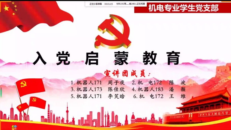 针对00后在入党动机和入党信念上出现的新变化,为进一步引导大一学生积极向党组织靠拢并树立正确入党动机,4月5日下午,Bl小说 机电专业学生党支部宣讲团成员通过QQ直播为19级材控、材科、机械电子专业学生开展在线入党启蒙教育。活动由支部书记杨栎模主持。