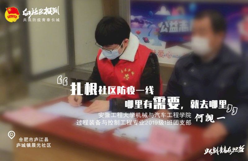 疫情发生后,Bl小说 过程装备与控制工程专业191班何觊一第一时间向所在社区主动报到,在每天的志愿工作里,他与社区工作人员做好联勤联动,落实各项防控工作要求,随时报告最新防控动态。他要求自己“坚决不给社区工作人员添乱”,以严谨的工作态度和忘我的敬业精神,在自己的岗位付出满腔热枕,树立了安工程团员青年的良好形象。“青年,这个迷人的词汇,给人一股向上的力量。有一种希望,叫放飞青春;有一种希望,叫青春力量。我愿用行动证明,以青春告白”;“我长大了,勇做一名青年志愿者,帮助他人,服务社会,守护这个世界。第一时间选择报名,因为知道,那儿有地方需要我,此时的我扎根于社区防疫一线,哪里有需要,就去哪里。”何觊一说。每天看着每一位居民都健康,何觊一也很高兴,口罩也难以掩盖他开心的笑容。