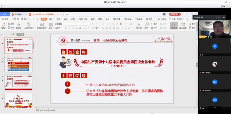 随后,杜贤赞老师为培训班学员讲授了第一次线上课程,讲座主题是学习解读“党的十九届四中全会公报”。通过分析全球各个国家在此次抗击新冠肺炎战斗中的应对方式和举措,用生动鲜活的案例,进行纵向历史比较和横向国际比较,指出从社会主义制度基本确立,到改革开放以来中国特色社会主义制度不断完善和发展,我国国家制度优势不断彰显、不断增强。