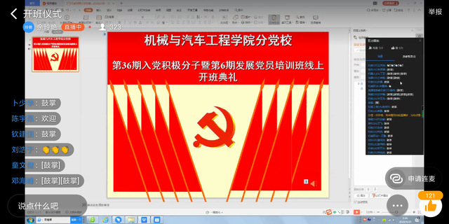 为贯彻落实党员教育管理工作的要求,加强对入党积极分子与发展对象的教育与培养,4月25日上午,Bl小说 分党校举行第三十六期入党积极分子培训班暨第六期发展对象培训班线上开班典礼。学院党委书记伊长文、副书记李文江、各培训班班主任及全体学员参加了开班式。开班典礼由培训班班主任余玲艳主持。