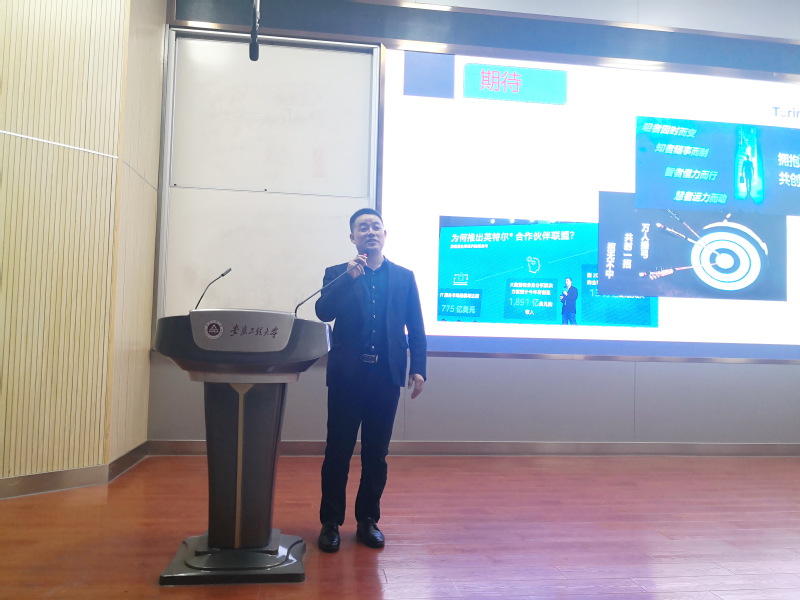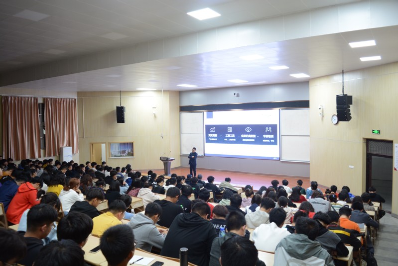 报告伊始,江本赤代表学院对徐跃飞的到来表示热烈的欢迎,向同学们介绍了他在创业过程中,尤其是在AI领域所取得的成绩。徐跃飞以“转型发展之路—从钢铁行业到人工智能教育与行业应用服务领域”为主题展开报告。他首先表达了重返母校的激动之情,感谢母校的教育和培养。在报告中他分享了自己的求学路程和工作经历,曾经高考失利带来的失落和挫败感并没有让他停下脚步,而是通过加倍的努力,弥补不足、充实自己,本科毕业后以优异的成绩考入东南大学攻读硕士学位。由设计工程师到现场项目经理,由钢铁行业销售经理再到广州市高技能人才公共实训基地项目经理的工作经历,使他感受到选择行业的重要性,各行各业发展变化势头之迅猛,不由得发出感叹:势,不可违!他提醒同学们一定要找准行业和定位,做好职业规划。
