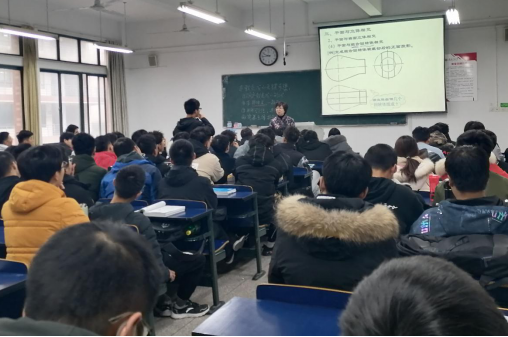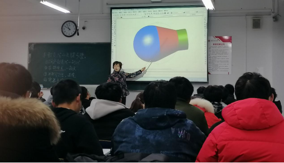秦老师主讲课程为《画法几何及机械制图》,此次主要讲授平面与组合回转体相交的截交线作图方法。秦老师采用引导启发式的教学模式,将板书和多媒体完美结合,并充分利用三维建模软件建立组合回转体的模型,使复杂的空间结构变得直观易懂,课堂互动良好,学生认真思考、积极回答问题,课堂气氛活跃。