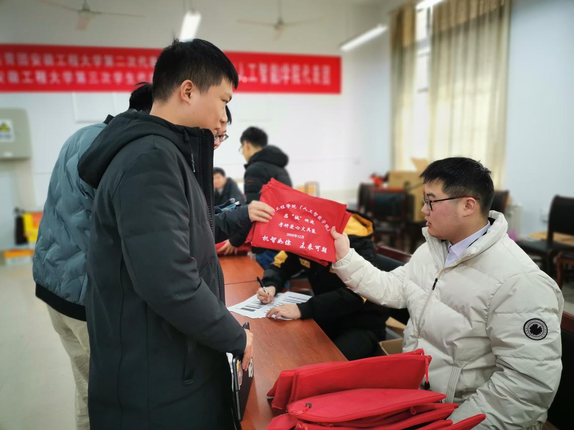 在1教104集中发放爱心文具袋活动现场,不管是现场温暖和谐的气氛,还是幽默热情服务的同学,都让考研学子们感受到了来自老师和同学们的鼓励与支持。此外,针对少数学子未能及时领取考研爱心文具袋的情况,学院领导带领毕业班辅导员前往学生考研教室,勉励考研学子坚持到底、沉着应考,充分发挥出自己应有的水平。