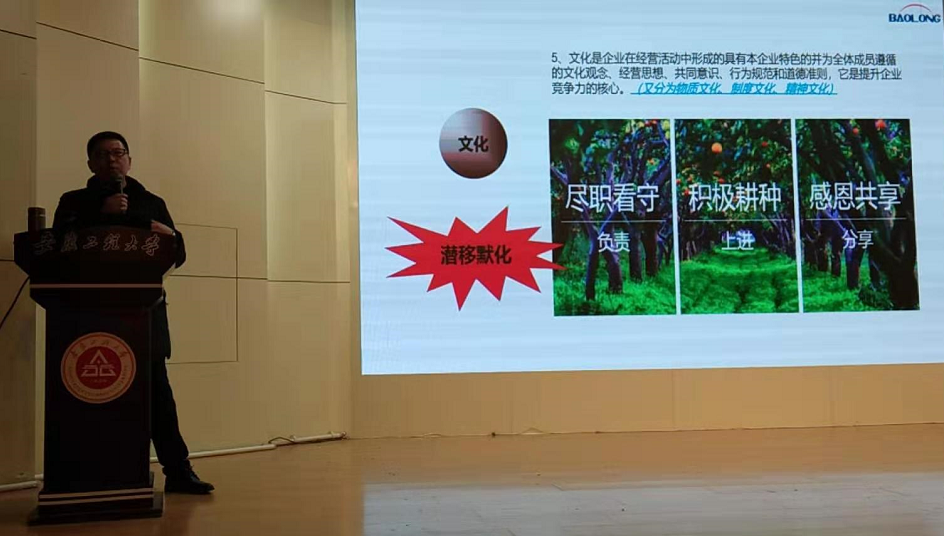 司马勇是上海保隆汽车科技股份有限公司宁国分公司人力资源部长,他从企业用人的角度作了“现代企业可持续发展及人才素质需求”主题报告,为同学们讲解了现代企业可持续发展的关键六要素,即“战略、研发、成本、创新、文化、人才”,剖析了人才素质需求的根源是如何保持企业可持续发展。他还从企业HR的角度跟同学们分享了如何培养这些素质,如何在面试中给HR留下深刻印象。而对企业忠诚、有归属感;有敬业精神和职业道德;掌握好的专业技术;善于沟通,保持亲和力;有团队精神和协作能力;认同企业文化;带着激情去工作;善于抗压,综合素质好是企业在选人用人时候尤为关注的几个重要方面。需要同学们从点滴做起,不断积累,成为现代企业真正需要的人才。