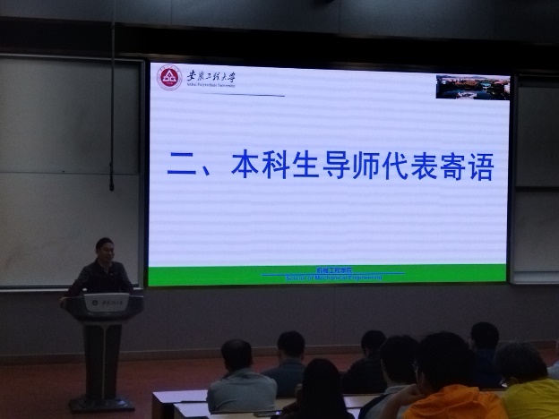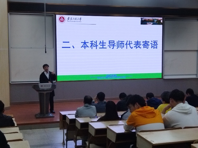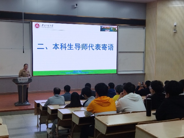 王建彬、唐铃凤、贾文友三位本科生导师代表做了生动的发言。王建彬强调,作为当代大学生要感恩情怀,要充分利用大学时光好好学习,收获自己该获得的,不给自己留下遗憾。唐铃凤给同学们提出了两点要求:一是学生的天职就是学习,用着父母的血汗钱,没有资格不学习;二是要发扬钉子“挤”和“钻”精神,“挤”碎片化时间进行系统学习,学知识要有“钻”劲,变知识为能力,希望每一位同学都拥有一个美好的未来。贾文友给同学们提出了六条有益建议:大学学习不是全部,但仍是最主要的任务;多参加学科和技能竞赛,提高实践能力;多与同学老师进行沟通,提高为人处世的能力;要德智体美劳全面发展;要有安全意识,时刻警记;学会自我规划,定目标才会有动力。贾文友以“天道酬勤,学道酬苦,业道酬精,人道酬诚”为结语,鼓励同学们努力奋进,持之以恒,无悔青春。
