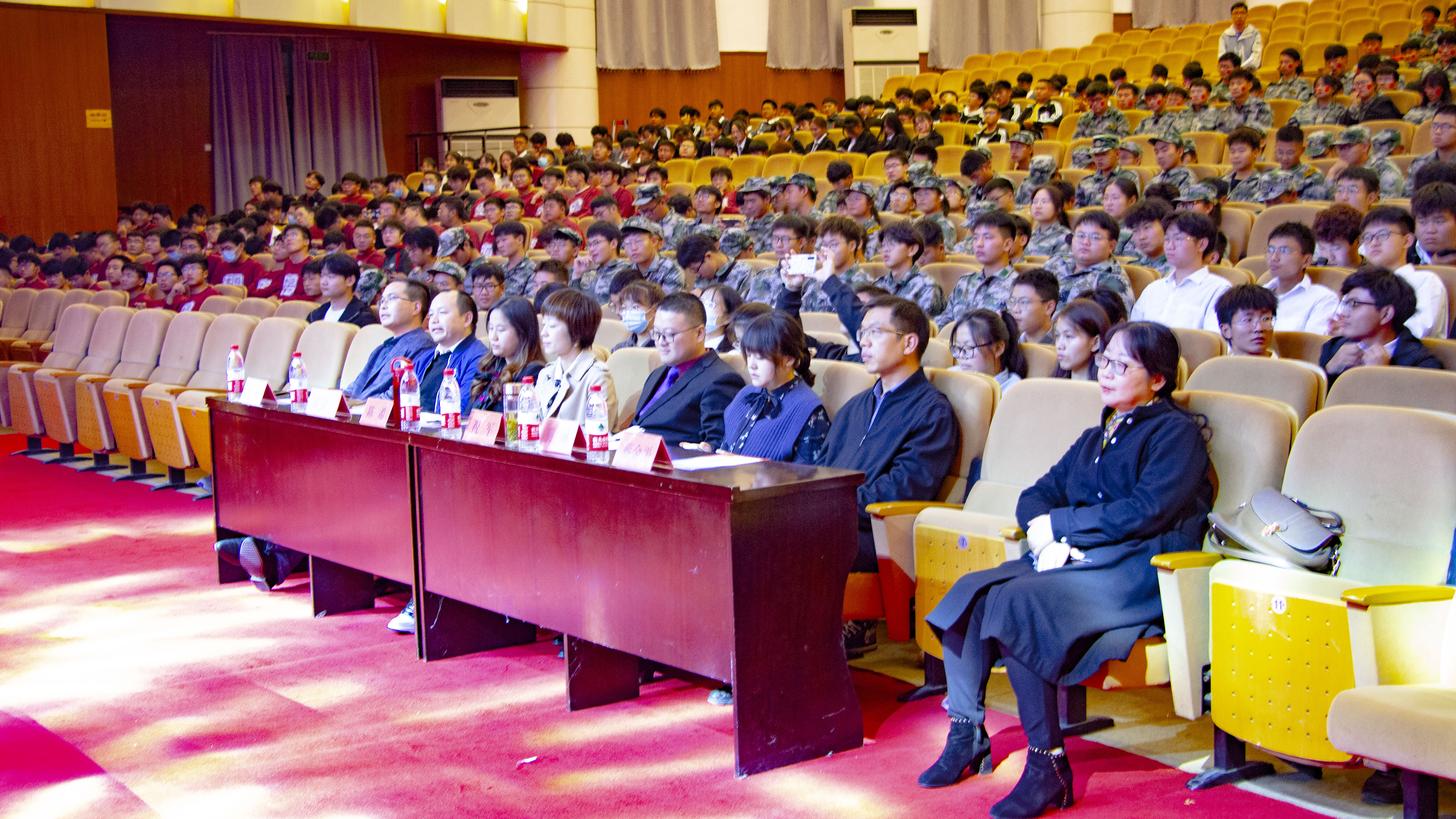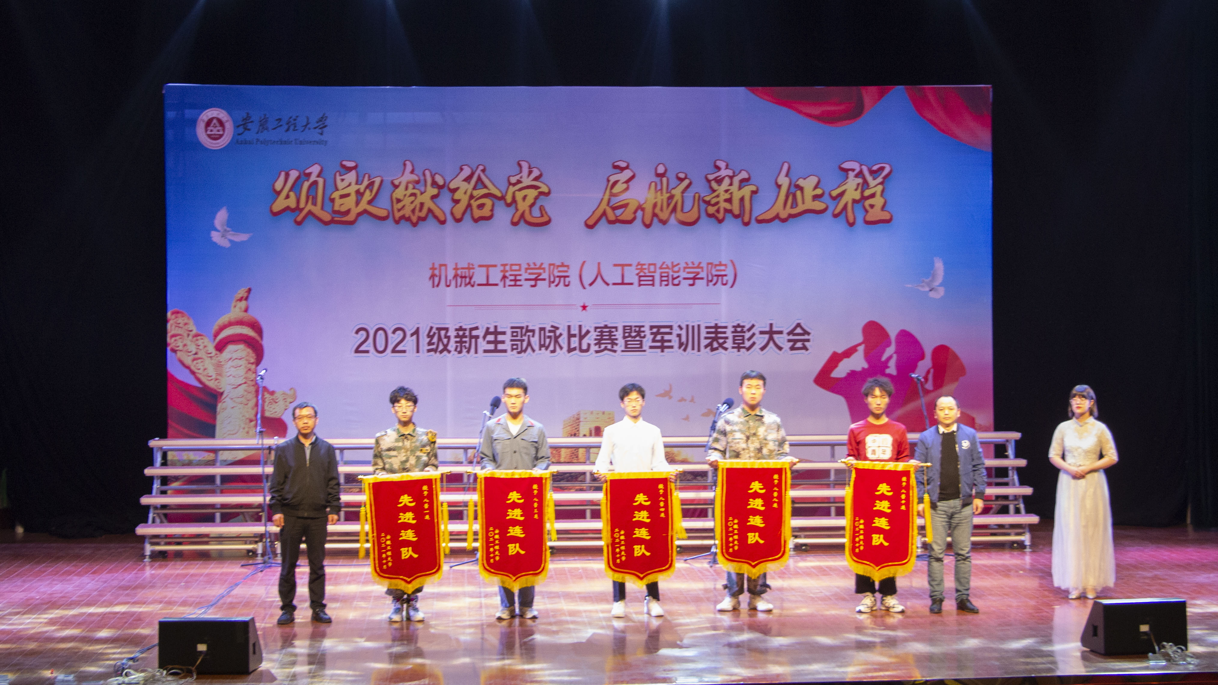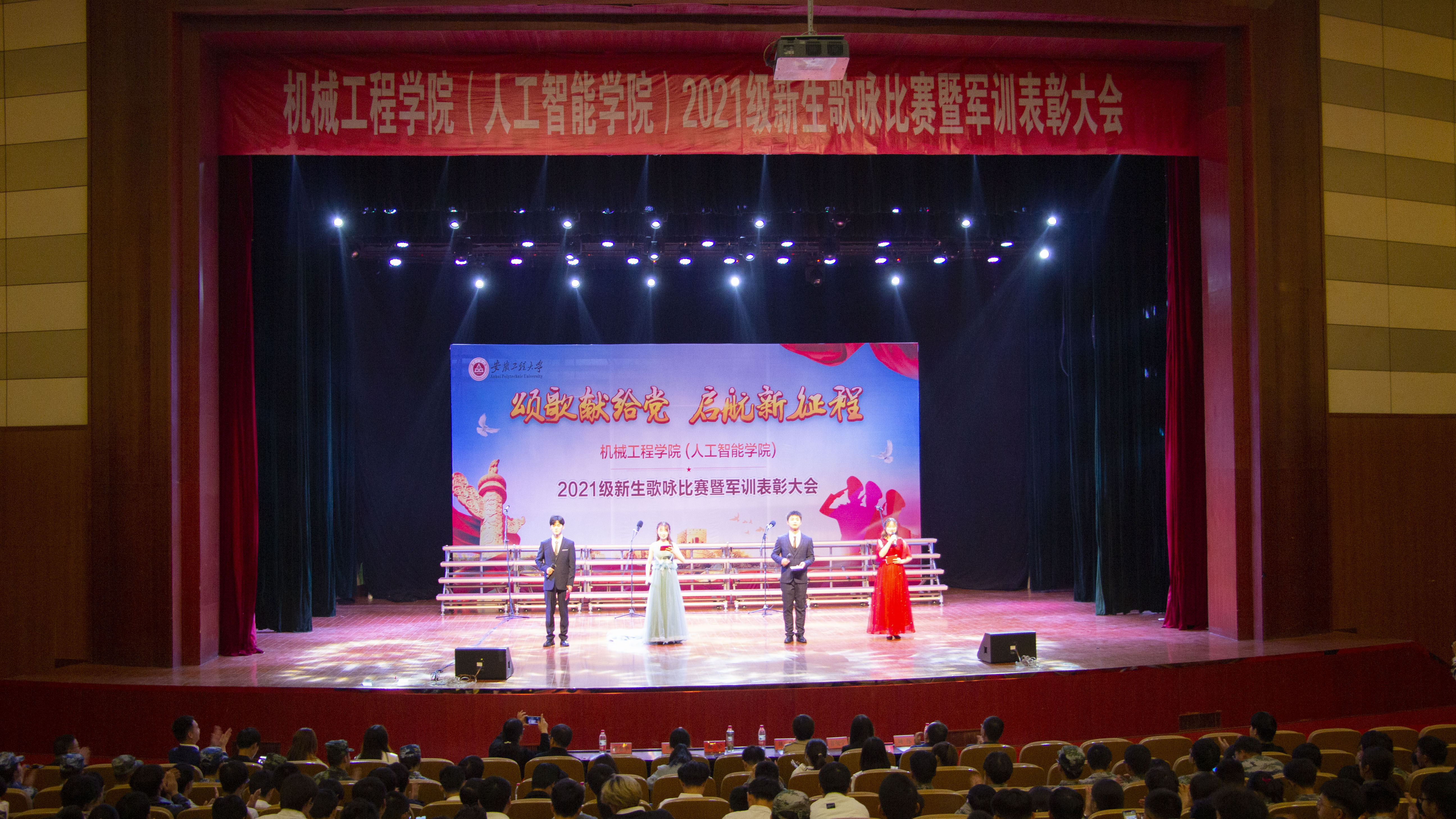 为庆祝中国共产党成立一百周年,推进党史学习教育深入开展,促进广大青年学生德智体美劳全面发展,激发爱党爱国爱校热情,10月29日晚,机械工程学院(人工智能学院)在师生活动中心举办2021级新生歌咏比赛暨军训先进个人表彰大会。学院邀请陈希、祝军、甘曼宁、奚琳四位老师担任评委,校学生处副处长刘伟,校团委副书记蔡金平,学院党委副书记李文江和何志恒,新生辅导员及部分新生军训教官莅临比赛现场,学院800多名2021级新生倾情表演。