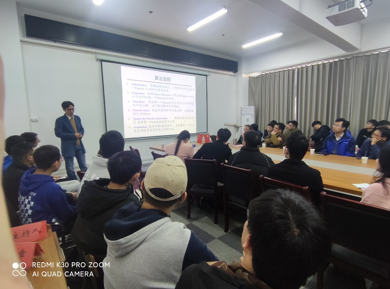 牛奔教授的报告分成四个部分:人工智能、群体智能、计算模型和成果转化。报告回顾了人工智能的发展历程,从复杂适应系统的角度对群体智能优化机理进行了阐述,介绍了几类典型群体智能优化算法(重点为粒子群算法(PSO)和细菌觅食算法)的基本原理、操作算子、基本流程和算法框架,提出了群体智能优化方法的提升方向及应用领域。报告内容深入浅出,对群体智能算法的基础和应用研究具有很大指导和借鉴作用。会议室座无虚席,与会人员踊跃提问请教,气氛相当热烈,会后,牛奔教授和相关专业教师就群体智能算法的细节问题进行了深入探讨,极大地开阔了教师和学生的视野,老师和学生受益匪浅。