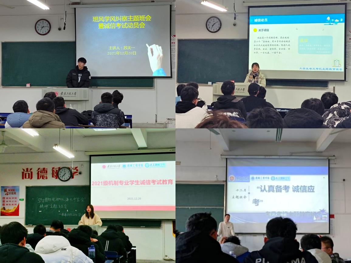 期末考试与研究生考试将至,机械工程学院(人工智能学院)全体辅导员结合各年级工作实际顺利完成12月份主题班会,重点围绕党史学习教育、诚信考试教育、毕业生考研就业指导、疫情防控与安全教育等主题开展教育宣传。