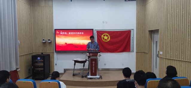 接着,全体新团员面向团旗端正肃立,举起紧握的右拳,在团员代表刘若辰同学的领誓下,完成了庄严的入团宣誓。铿锵有力的宣誓声在教室中回荡,庄重的誓词让新团员更加明确了自己肩上的责任与使命。机制201团支部的郑乐飞同学作为新团员代表上台发言,在他的讲话中提出了对未来团员历程的期望,对新团员自身提出了需改善的方面。苑雨露对各位新团员的加入表示了热烈的祝贺,并提出了殷切期望。在疫情形式仍较严峻之时,每位团员更应严格监督自己,遵守学校的规定,做好带头作用,努力将自己培养成为⼀名合格的团员。