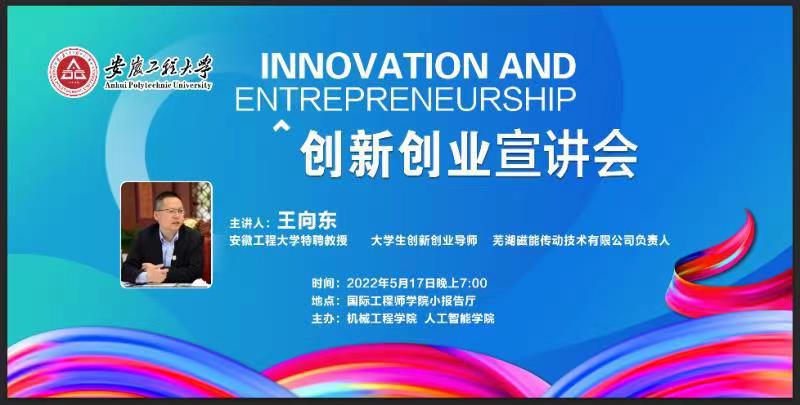为提升大学生创新创业能力,激发大学生创业意识,丰富大学生的创新创业知识,5月17日晚上,学院特邀芜湖磁轮传动技术有限公司董事长、Bl小说 特聘教授王向东开展创新创业主题宣讲会,100余名本科生、本科生指导教师参加宣讲会。报告会由学院党委副书记李文江主持。