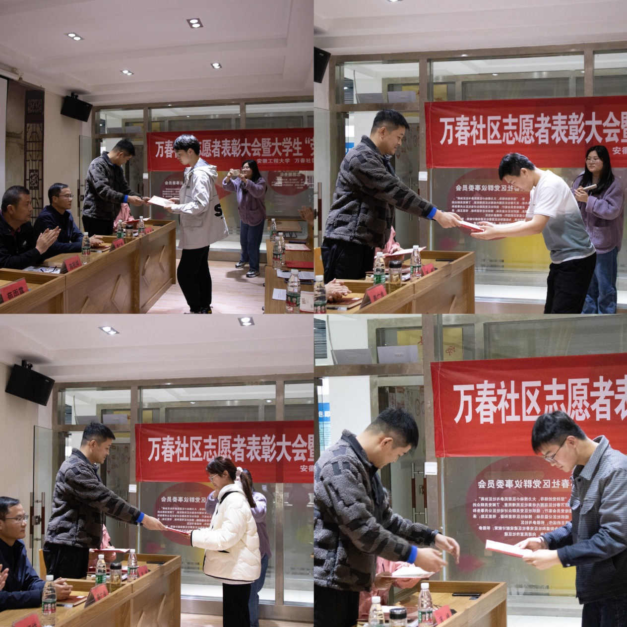 为推进“三全六专”育人实践,强化“1+14”共建,4月24日,机械工程学院联合芜湖市清水街道万春社区举行了志愿者表彰大会暨大学生“劳动+”志愿服务基地挂牌仪式,清水街道党工委副书记陈祝祥、万春社区党委书记潘峰、机械工程学院党委副书记秦广虎、人工智能学院团委副书记苑雨露、机械工程学院团委副书记王海燕及志愿者代表参会。会议由万春社区工作人员倪阳主持。