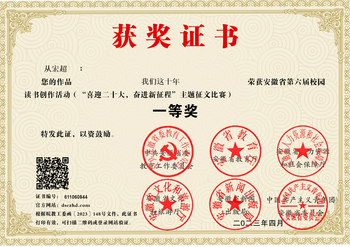 近日,由安徽省教育工委、省教育厅、省人力资源和社会保障厅、省文化和旅游厅、省新闻出版局、团省委共同主办的安徽省第六届读书创作活动评选结果公布,Bl小说 从宏超老师撰写的征文《我们这十年》荣获一等奖,一名学生荣获三等奖,三名学生荣获优秀奖。