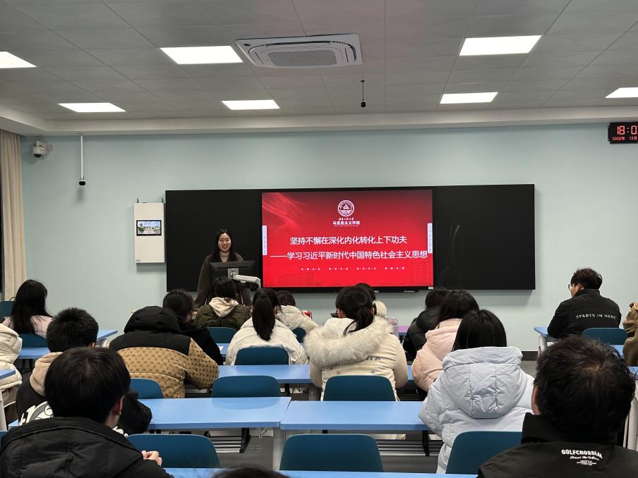讲座结束后,与会同学分成四组,各自围绕《开辟马克思主义中国化时代化新境界》等读书体开展学习交流。车辆231王保金表示新时代青年要培养爱国情怀,树立远大志向,努力成为一个有理想、有学问、有才干的实干家。人工智能232周智豪表示要听党话、跟党走,用党的创新理论和先进思想武装头脑,让奋斗成为青春最亮丽的底色。