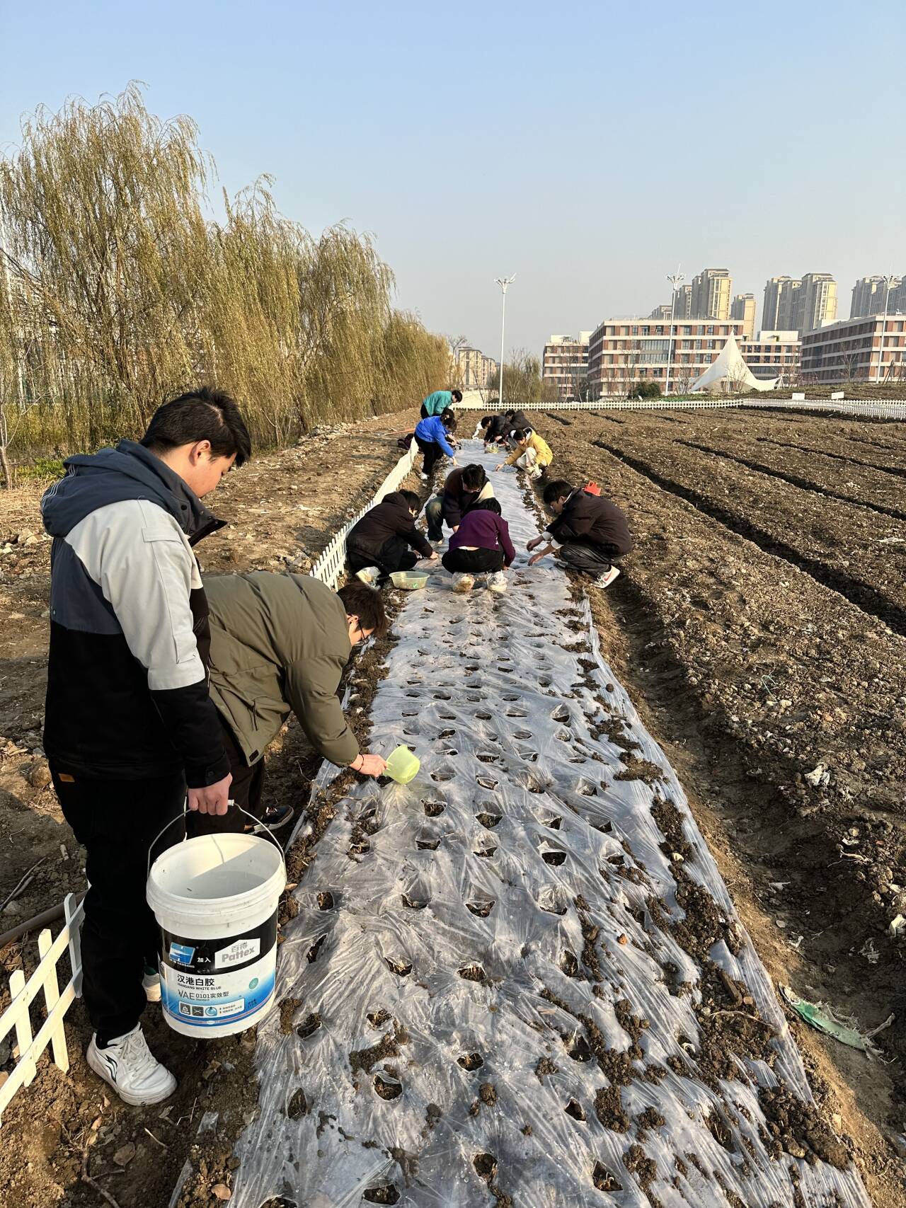 迎着冬日的暖阳,同学们准时在梦溪农场集合,他们带着管委会提供的铁锹、耙子、小铲子、水桶等工具,在专人的带领下开展施肥、翻土、盖薄膜、种苗等工作,时而分散、时而协作。经过近两个小时的辛勤劳作,所有的洋葱和韭菜新苗都栽种完毕,同学们纷纷表示体验到了劳动的快乐和成就感。