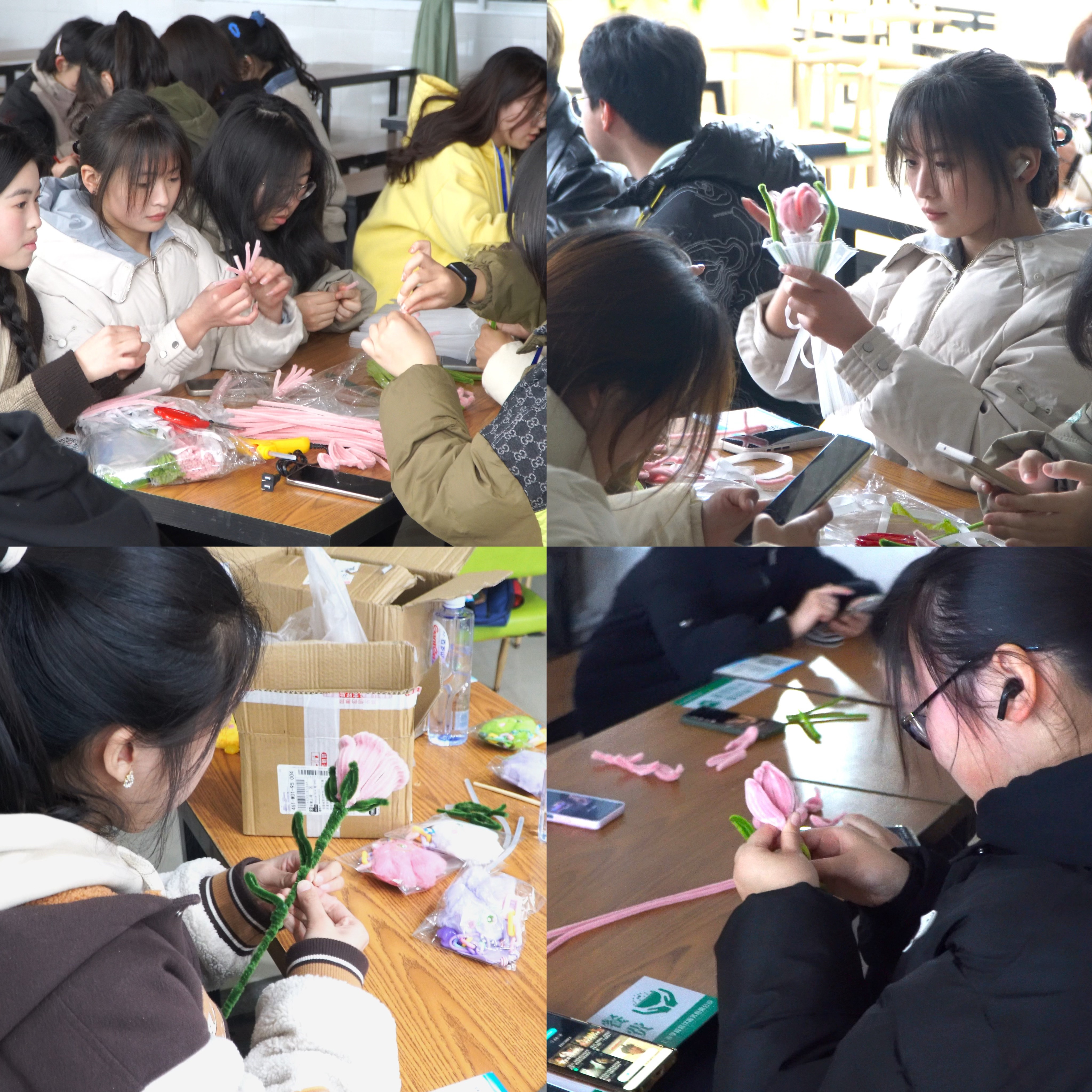 活动采用制作手工扭扭捧花的方式进行,经过前期宣传,共吸引了50余名学生参加。为了确保活动顺利进行,学院精心准备了足够的酒红玫瑰、粉红郁金香、樱桃粉玫瑰三种花的制作原料及必需工具。活动现场,参与同学跃跃欲试,结合网络教程视频和自身经验,手脑并用、专心制作,积极交流、气氛热烈,经过2个小时的不懈努力,一朵朵美丽的花便呈现在大家面前。车辆201郭晟晟表示,此次活动有趣、有料、有意义,我们可以从中感受到做手工的快乐,也可以通过团结协作增进同学间的感情。