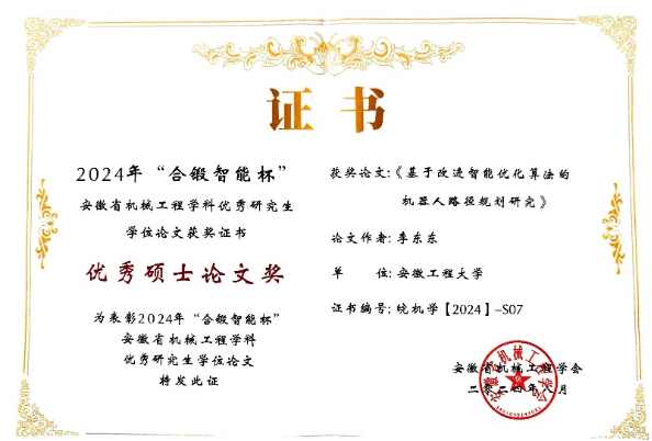 8月30日,安徽省机械工程学会第十次会员代表大会在合肥召开。安徽省机械工程学会开展了优秀研究生学位论文奖评选活动,来自中国科学技术大学研究生院科学岛分院、合肥工业大学、安徽大学、Bl小说 等10名研究生获得2024年“合锻智能杯”安徽省机械工程学科优秀研究生学位论文奖,其中博士学位论文奖3篇、硕士学位论文奖7篇。会议期间,中国工程院院士陈学东、合肥合锻智能制造股份有限公司董事长严建文为获奖者颁奖。Bl小说 2023届毕业研究生李东东同学的硕士学位论文《基于改进智能优化算法的机器人路径规划研究》(导师:王雷教授)获得优秀硕士论文奖。