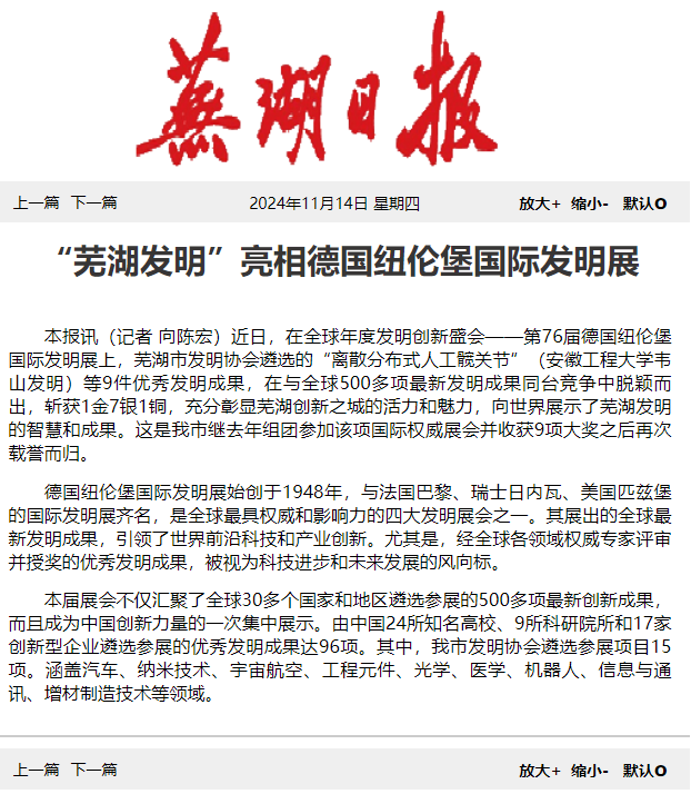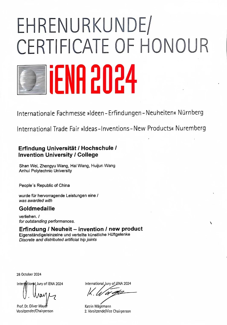 2024年“第76届德国纽伦堡国际发明展”于2024年10月26日-28日在德国纽伦堡国际展览中心举行。在芜湖市发明协会的指导下,Bl小说 韦山副教授团队的发明专利《离散分布式人工髋关节》勇夺金奖,同时也是安徽省和芜湖市唯一的金奖。时培成教授团队的《一种全线控全向型车辆底盘系统和控制方法》和肖平教授团队的《适于飞行汽车的可折叠升降装置及其折叠和展开方法》两项发明专利均获得银奖。