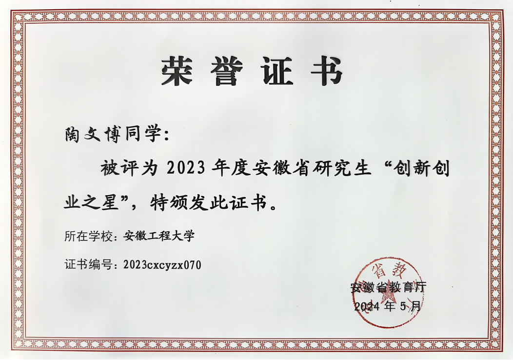 陶文博在校期间时刻严格要求自己,争做学生榜样,努力学习,为学校争荣,为学院增光。2022年创立安徽博松科技有限公司,并成功申报芜湖市紫云英项目获转化资助80万元,受邀出席“2022芜湖紫云英金秋人才周”活动,成为众多创业者的学习榜样。他在学科竞赛上取得国家级奖项2项、省级奖项6项、市级奖项4项,校级奖项8项等成绩;对于学术科研,他参加各类科研创新活动,发表SCI论文,发明专利授权2项,发明专利受理多项,获校“十佳大学生提名”荣誉称号。