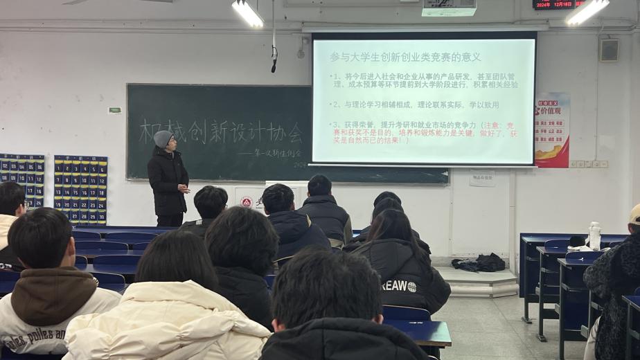 漆小敏老师以协会的历史沿革为引子,穿插个人指导竞赛的丰富经历,生动诠释了创新对于大学生成长成才的重要意义。他强调,参与创新创业类竞赛不仅能为未来的创业和职业生涯奠定坚实的实践基础,包括团队管理、项目开发等多方面的能力积累,更是对“学有所成,不断进步”理念的最好践行。老师鼓励协会成员们要将理论知识与实践技能紧密结合,通过实际操作将所学知识转化为解决问题的能力,从而在实践中不断磨砺自我,提升修养。
