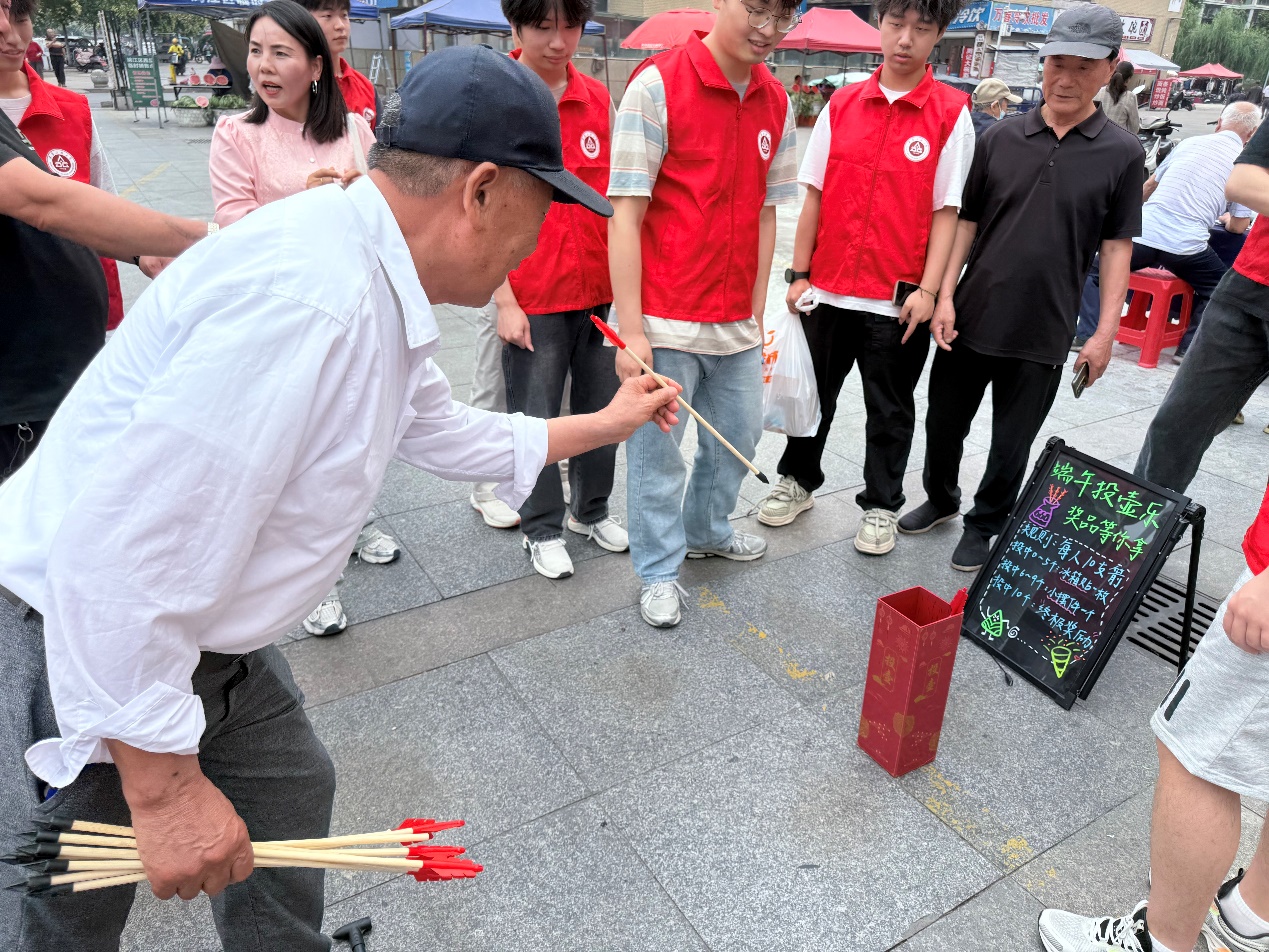 活动现场,投壶小游戏成为一大亮点。投壶作为传统民俗游戏,深受居民喜爱。社区精心准备了丰富小奖品,居民们踊跃参与,在欢声笑语中感受传统游戏的魅力,既增进了邻里情谊,又体验到传统文化的独特韵味。
