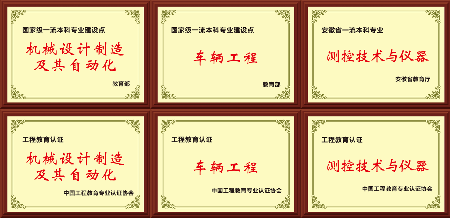本科办学底蕴丰厚。学院已由1978年本科办学时的单一专业发展到目前的多个门类专业,其中机械设计制造及其自动化、车辆工程、材料成型及控制工程(学院分设后划转至材料科学与工程学院)等3个专业在同一教指委下陆续获批国家一流专业建设点。机械设计制造及其自动化在全校率先通过工程教育专业认证,车辆工程、测控技术与仪器先后通过工程教育专业认证。车辆工程专业、汽车现代产业学院入选安徽省“双特色”建设项目。