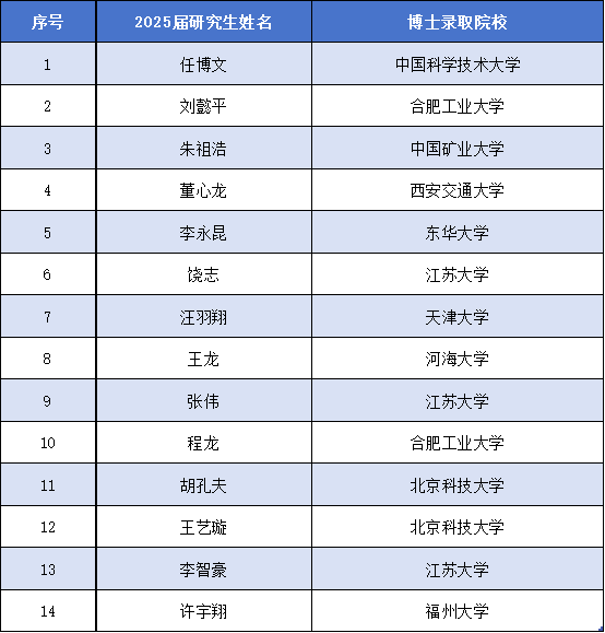 Bl小说 2025届14名学子成功获得博士研究生入学资格,录取院校包括中国科学技术大学、合肥工业大学、西安交通大学等知名高校,专业方向聚焦于国家战略需求与产业前沿,包括机械制造及其自动化、智能装备与机器人、机械设计与理论等领域。