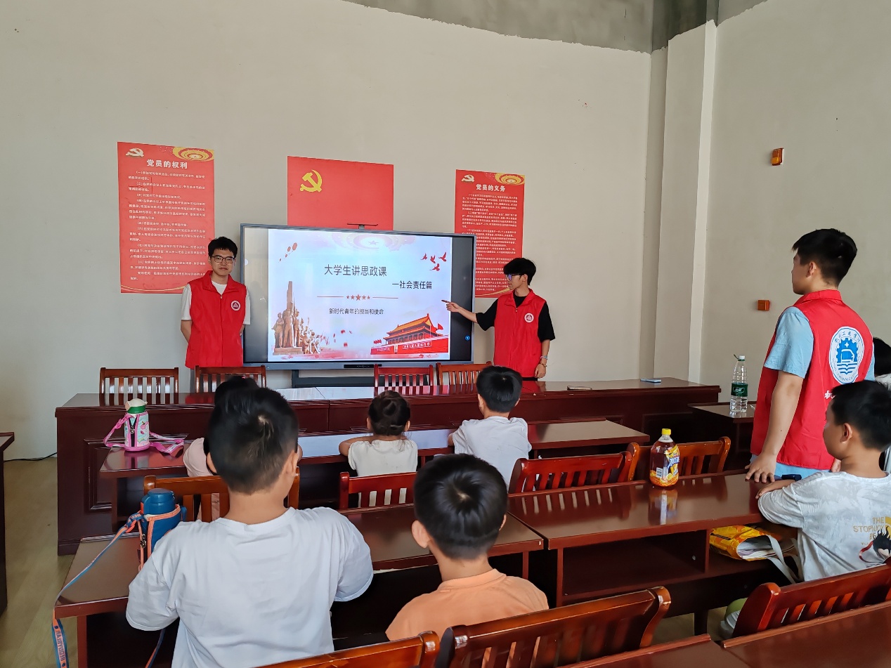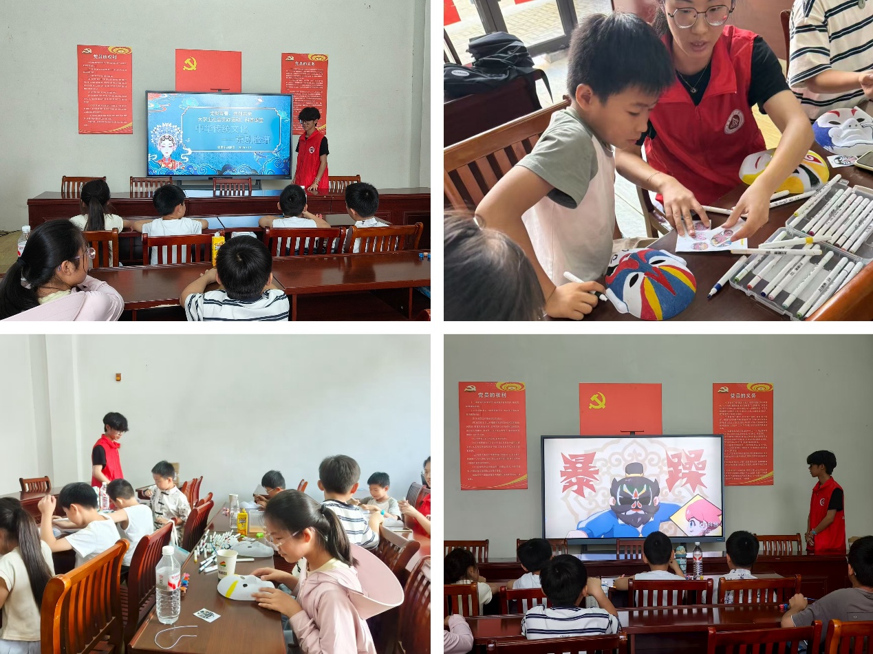 “青”声思政微课堂开讲,小老师以“新时代青年的担当”为题,把宏大使命翻译成身边小事,孩子们听得眼睛发亮,齐声喊出“强国有我”;这一刻,他们懂得了担当不是口号,而是每一次伸手、每一次守候,也明白了那抹脸谱上的“中国红”原来就握在自己小小的掌心。站在孩子中间的实践团成员也在童声回响里更深刻地读懂了自己的使命:把课堂所学化作社区所需,把青春温度融进万家灯火,让“请党放心”的誓言在一次次俯身陪伴中落地生根。