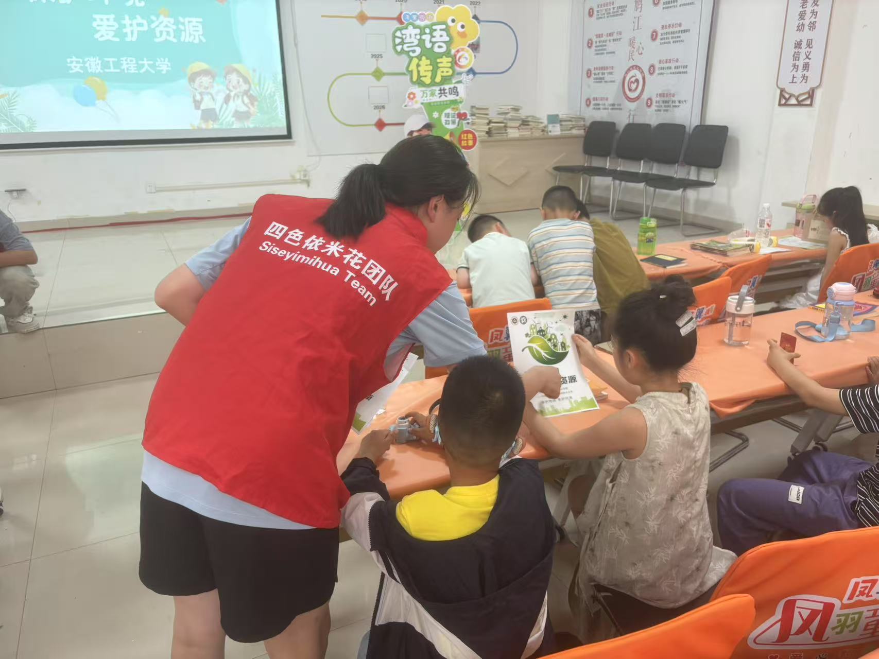 捐书活动的余温尚未散去,绿色环保宣传活动便紧接着展开。四色依米花团队的成员们迅速整理好场地,将精心制作的PPT投射在屏幕上,配合着图文并茂的宣传单页,系统地向孩子们普及环保知识。团队成员从生态平衡的重要性到环境污染的具体危害,从宏观的地球生态到身边的社区环境,内容详实且通俗易懂,让绿色理念在直观的展示与耐心的讲解中慢慢渗透。