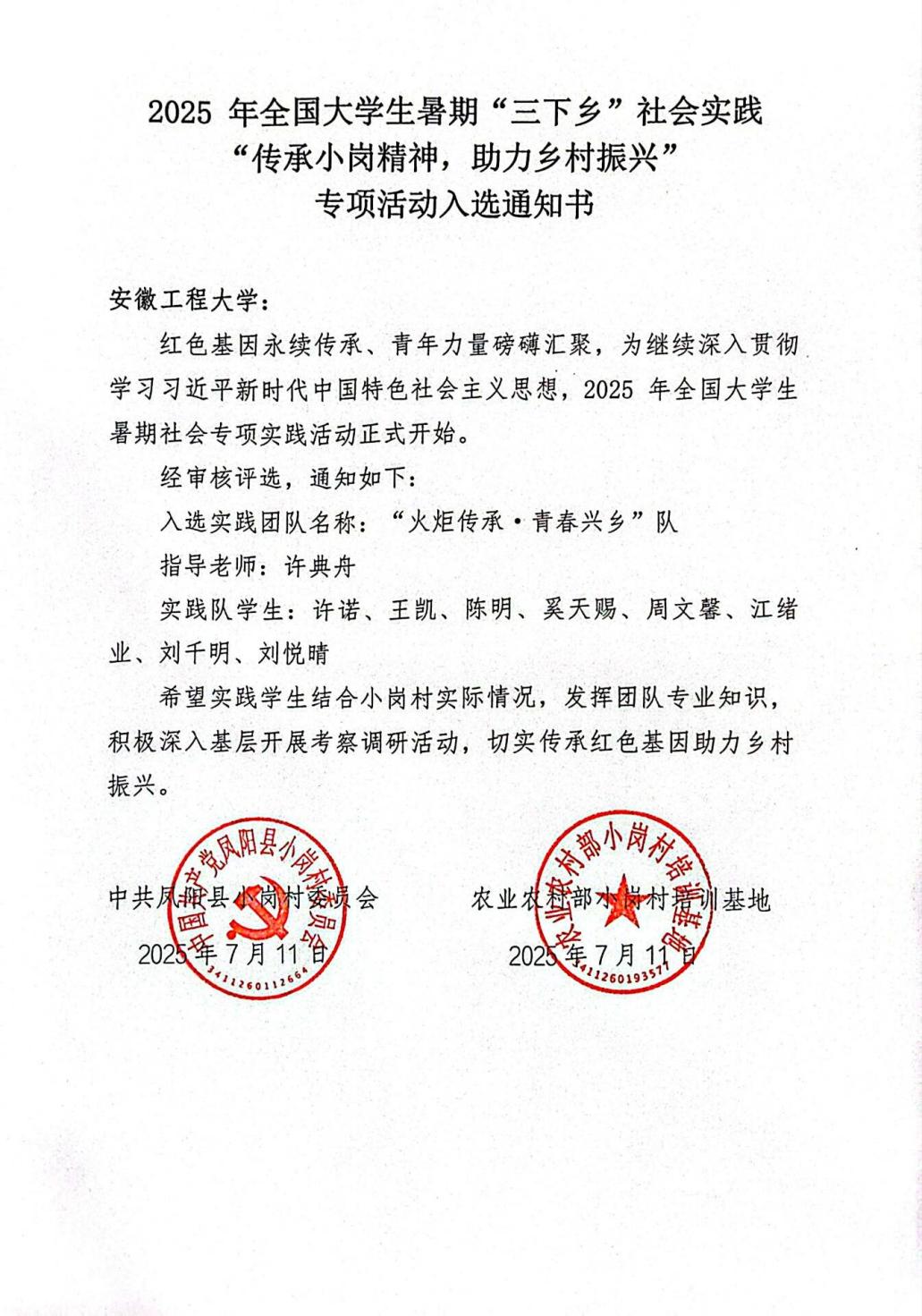 为落实习近平总书记在安徽小岗村农村改革座谈会上的重要讲话精神,引领广大青年学子在建设社会主义现代化强国的新征程中更好地传承和发扬“小岗精神”,经团队申报、组织遴选,Bl小说 “火炬传承 青春兴乡”团队成功入选2025年暑期“三下乡”专项活动。