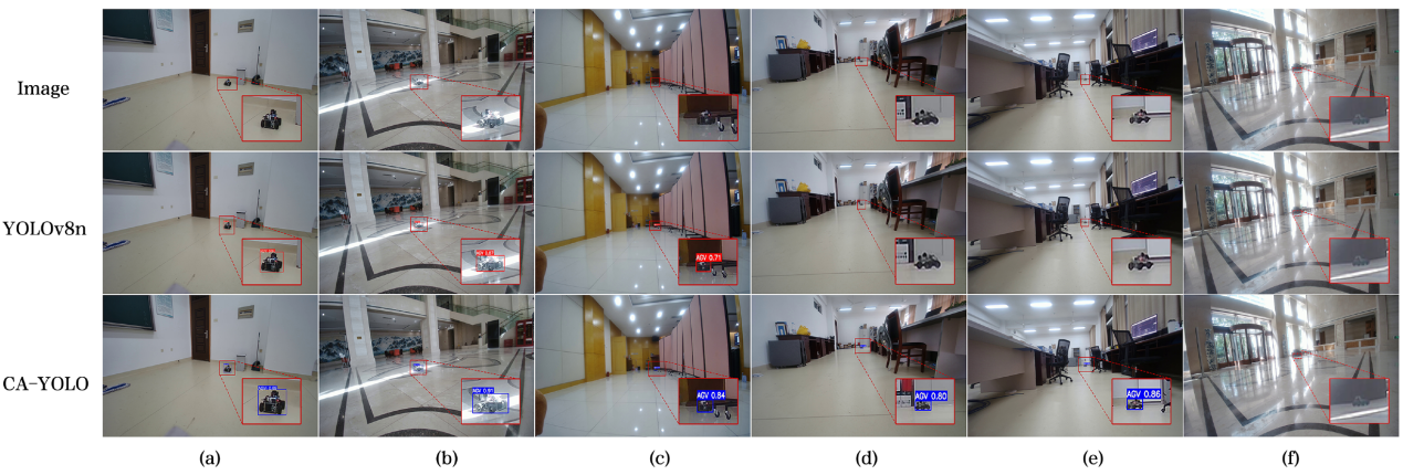 图2 YOLOv8n 和 CA-YOLO 模型在不同场景下对AGV检测结果对比