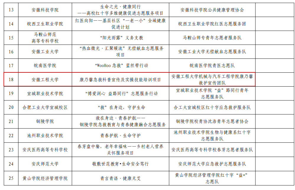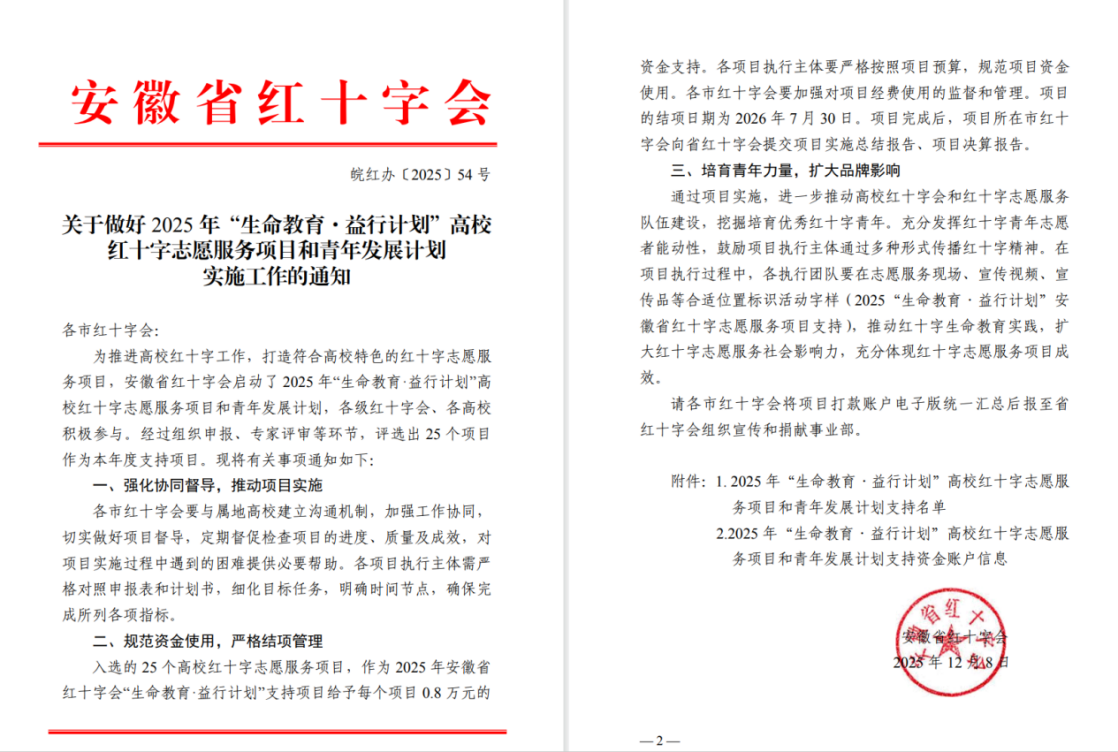 “生命教育・益行计划”是安徽省红十字会打造的特色志愿服务品牌项目,旨在推进高校红十字工作创新发展,培育优秀红十字青年力量。经过组织申报、专家评审等多轮严格筛选,全省共25个高校项目脱颖而出,获得专项资助。该计划不仅为高校志愿服务项目提供资金保障,更搭建了交流展示平台,助力扩大红十字精神的社会影响力。