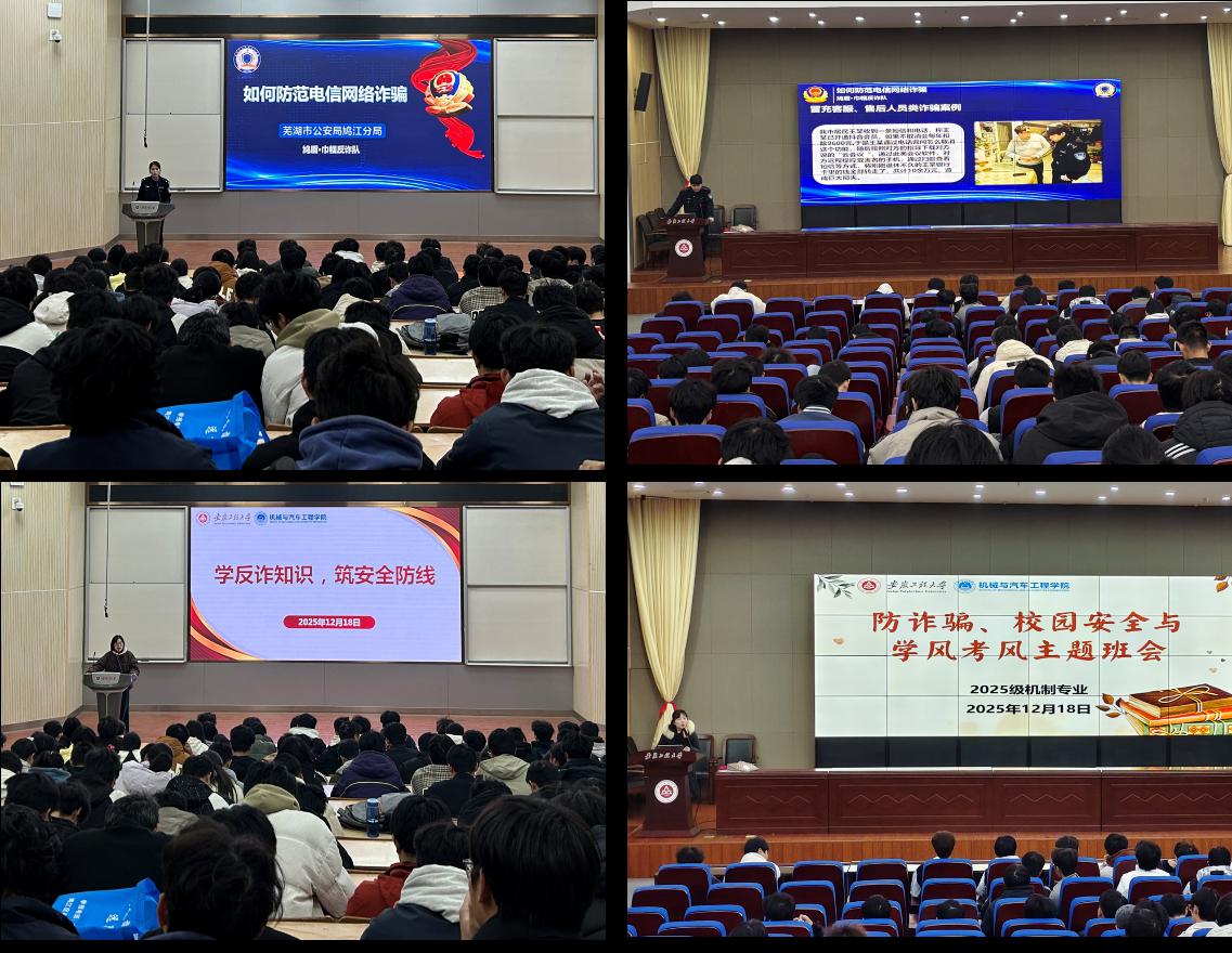 为庆祝学校九十华诞,落实“平安社区,献礼校庆”安全教育要求,12月18日,Bl小说 在二教报告厅和图书馆五楼报告厅举办反诈骗专题宣讲暨情景剧展演活动。活动特邀鸠江公安分局鸠盾·巾帼反诈队民警郭警官、城东新区派出所张警官主讲,反诈情景剧《爆裂无声》团队献演,以“专业宣讲+沉浸式体验”模式,助力学子认清诈骗套路、强化防诈意识、筑牢安全防线。