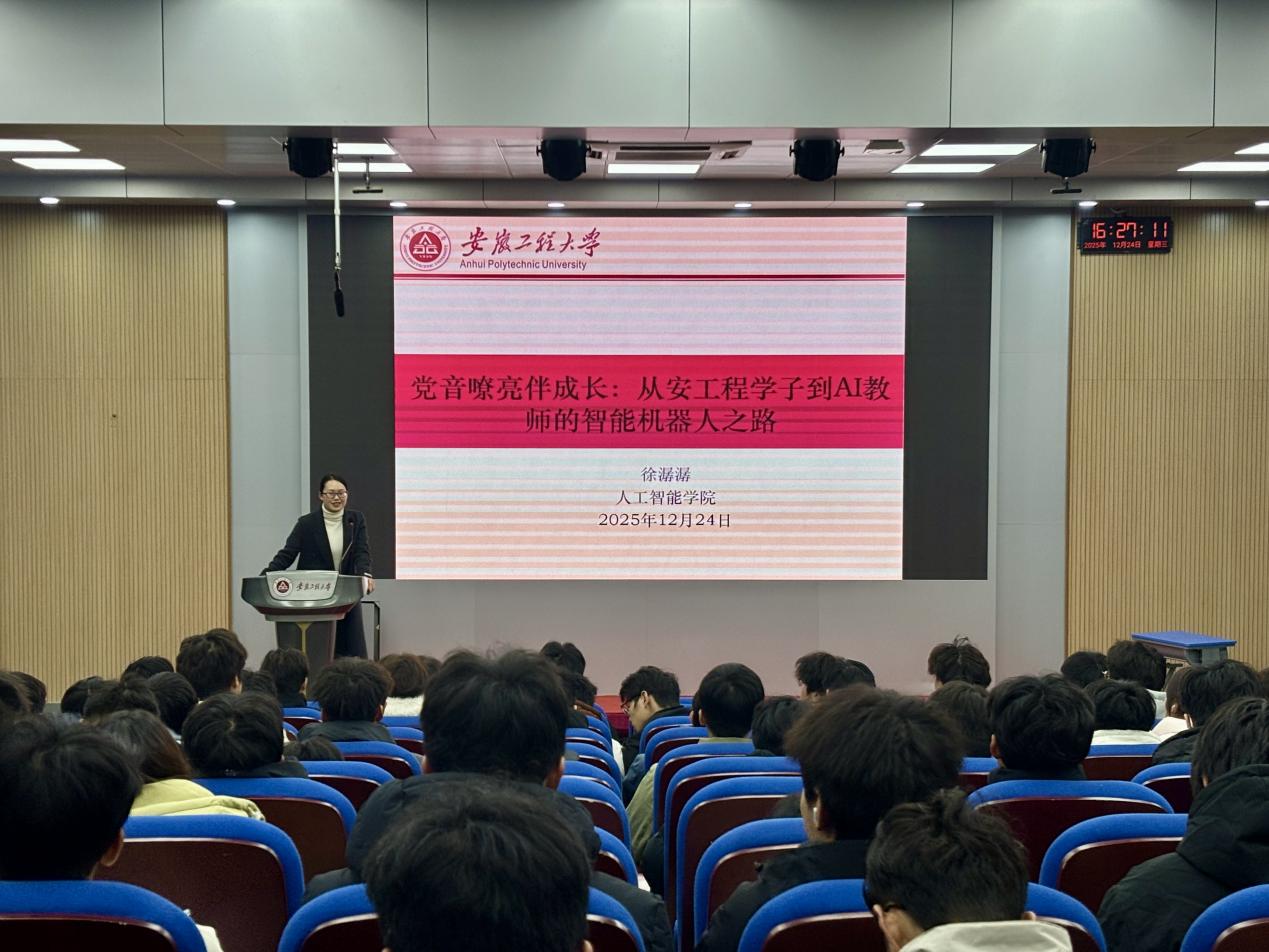 12月24日下午,机械与汽车工程学院在5教117报告厅举办“党音嘹亮”大讲堂活动。本期活动邀请人工智能学院徐潺潺博士作《党音嘹亮伴成长:从安工程学子到AI教师的智能机器人之路》专题讲座。学院大讲堂负责人时慕天、辅导员陈静、2025级青马班学员和递交入党申请书的学生骨干等100余人参会。讲座由时慕天主持。