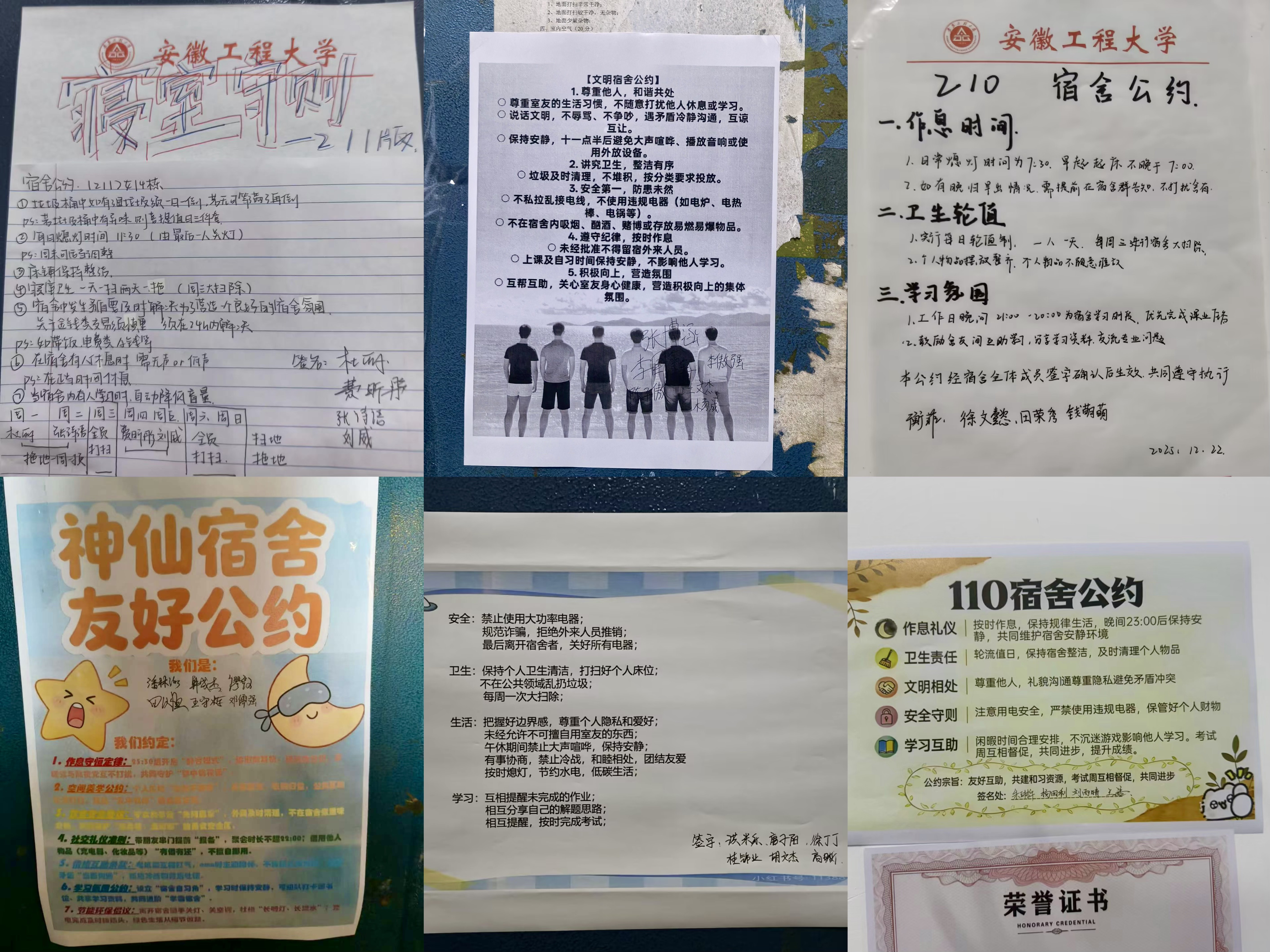 活动以宿舍为单位,组织学生结合学习生活实际,共同制定或修订宿舍文明公约。公约内容在涵盖作息时间、卫生轮值与学习氛围等基础模块的同时,积极融入九十周年校庆元素及宿舍安全、消防安全、防诈骗等专题内容,充分激发了学生的创造力与主体意识。各宿舍通过手绘海报、艺术排版、集体签名设计等创意化形式,将公约转化为兼具规范性、审美性与宿舍特色的“室内文化标识”。所有学生宿舍均已完成全员签字确认,并将公约张贴于宿舍公共区域,成为大家共同遵守的集体承诺。