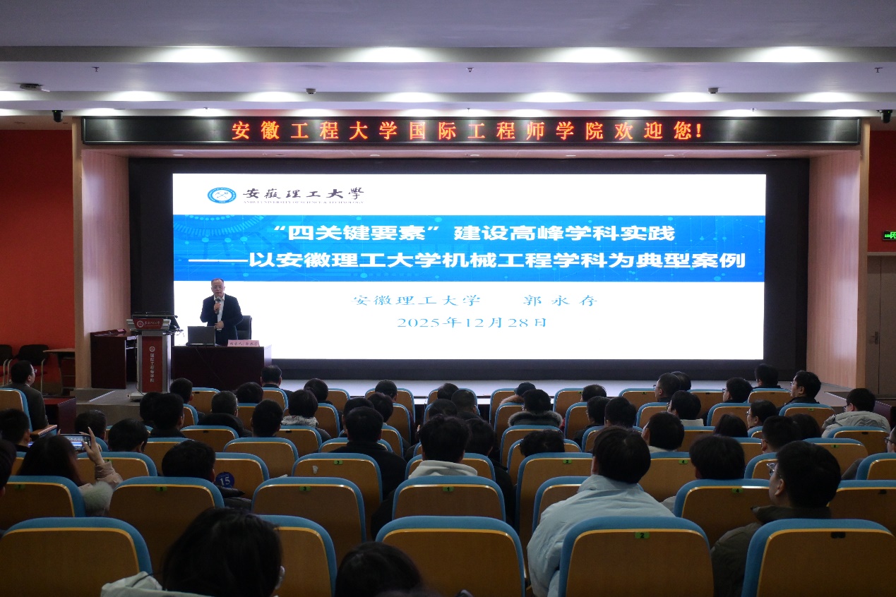 郭永存对Bl小说 机械工程学科围绕汽车产业开展方向凝练、队伍建设、平台建设给予了充分肯定。他指出,机械工程学科要进一步加强研讨,精准凝练学科方向,形成差异化竞争优势;要立足区域产业布局与学校学科发展基础,强化跨学科协同,进一步凸显竞争力;要聚焦关键要素,在高能级平台、高水平师资、重大项目、高水平科技成果等方面精准发力。座谈会之前,郭永存在国际工程师学院校区赤铸报告厅为Bl小说 师生作了题为《“四关键要素”建设高峰学科实践——以安徽理工大学机械工程学科为典型案例》的学术报告会。