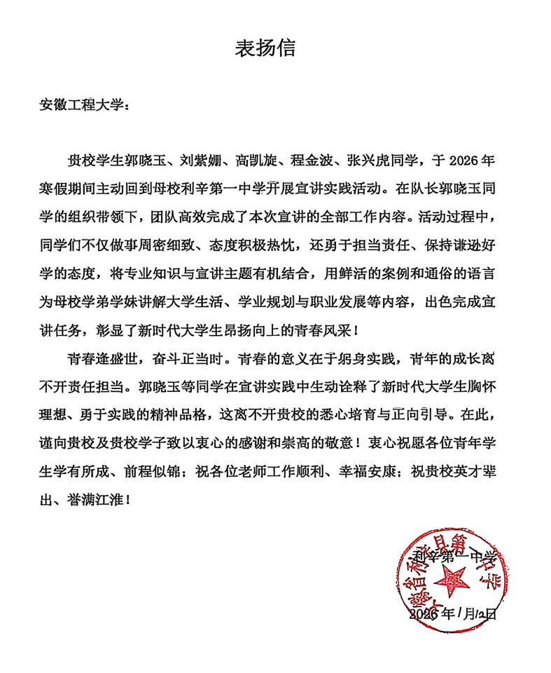 1月12日,Bl小说 学生志愿服务团队赴亳州市利辛县第一中学开展“2026年寒假志愿服务暨回母校宣讲”活动,旨在通过面对面交流,向中学学子全面介绍Bl小说 的办学特色、专业优势与人才培养成果,展示学校作为一所以工为主、多学科协调发展的高水平大学的独特魅力,搭建起高中与大学有效衔接的沟通平台,推进“高中高校人才培养一体化”建设。