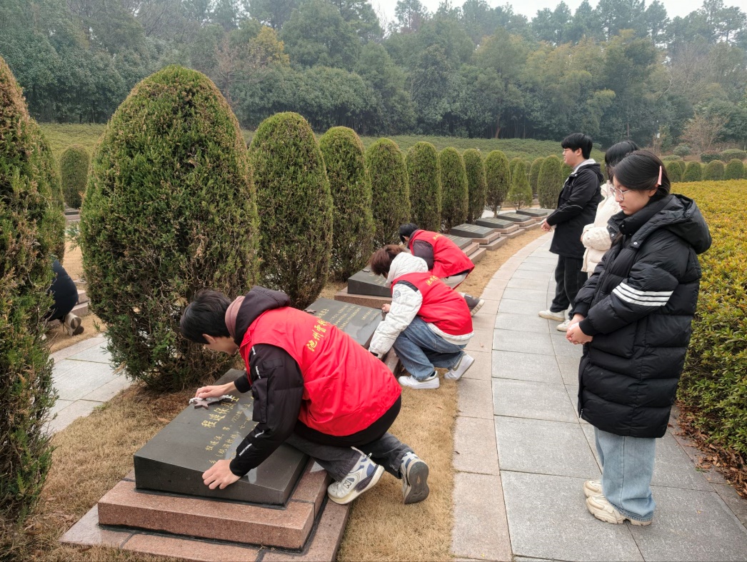 走出展厅,队员们列队来到烈士墓区。在凌霄烈士墓碑前,大家俯身细致擦拭碑体,轻轻拂去尘埃。这一举动不仅是对烈士的深切缅怀,更是对红色精神的自觉传承。团队成员表示:“手指触摸碑文的那一刻,仿佛能感受到历史的温度。我们擦拭的不仅是一块石碑,更是一段不能被遗忘的记忆。”
