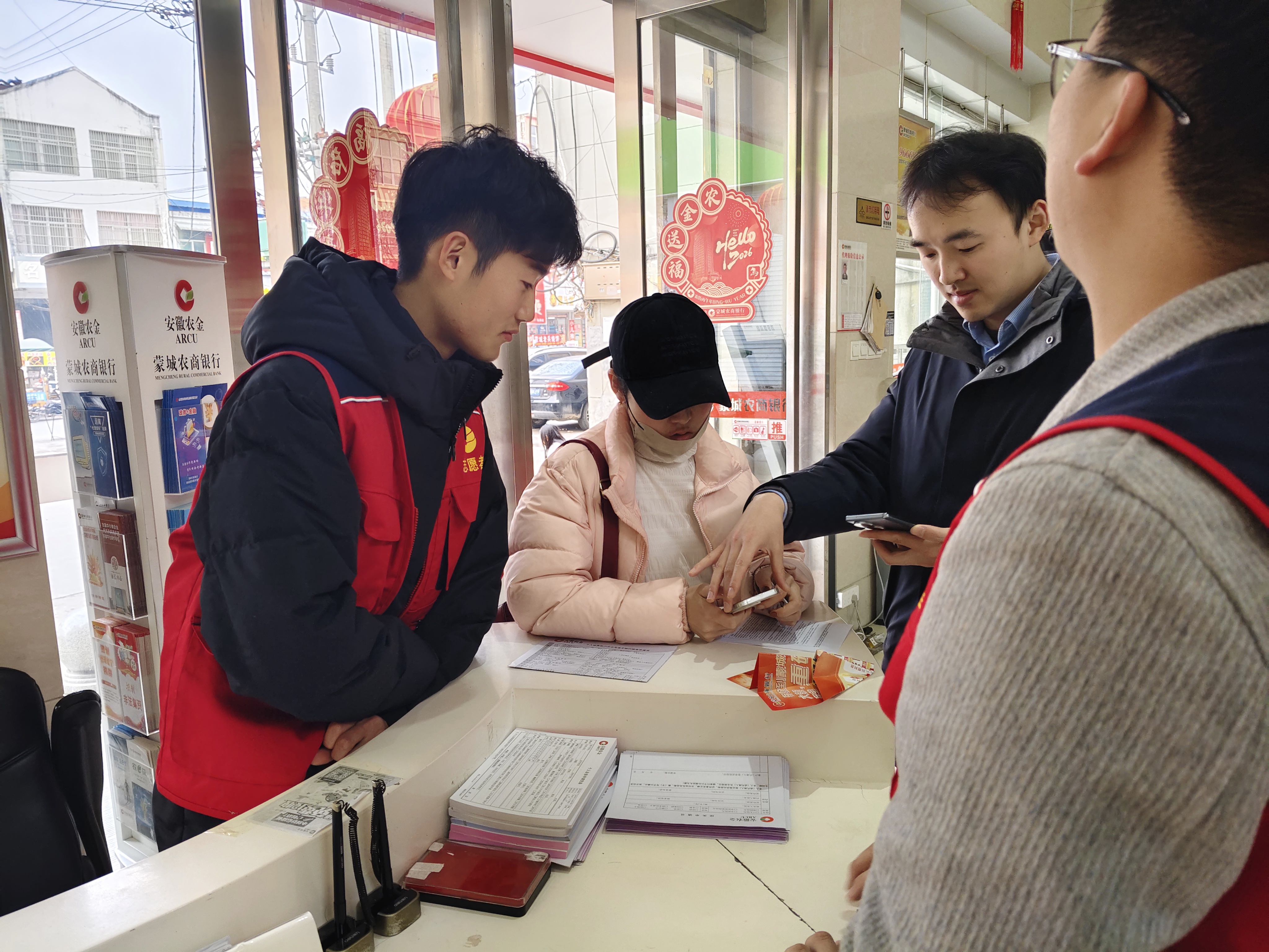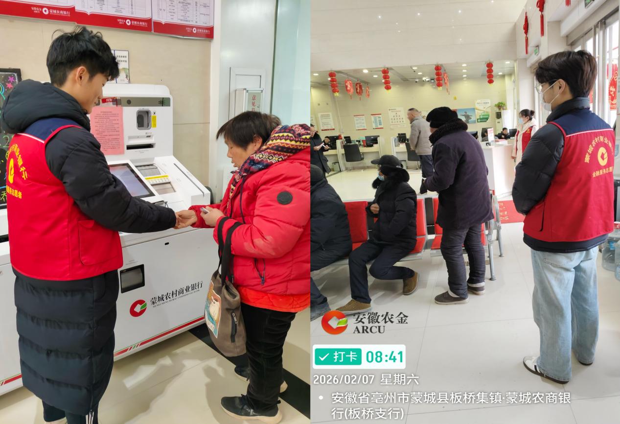 二月伊始,志愿服务转入常态化助老服务。在蒙城县板桥集镇农商银行,经过系统培训的志愿者们耐心协助老年群体办理业务,手把手指导ATM机操作,用细致服务让老年人“办事少跑腿”。面对重复的日常工作和偶尔的误解,志愿者们始终坚守岗位,以“俯首甘为孺子牛”的精神践行责任担当。