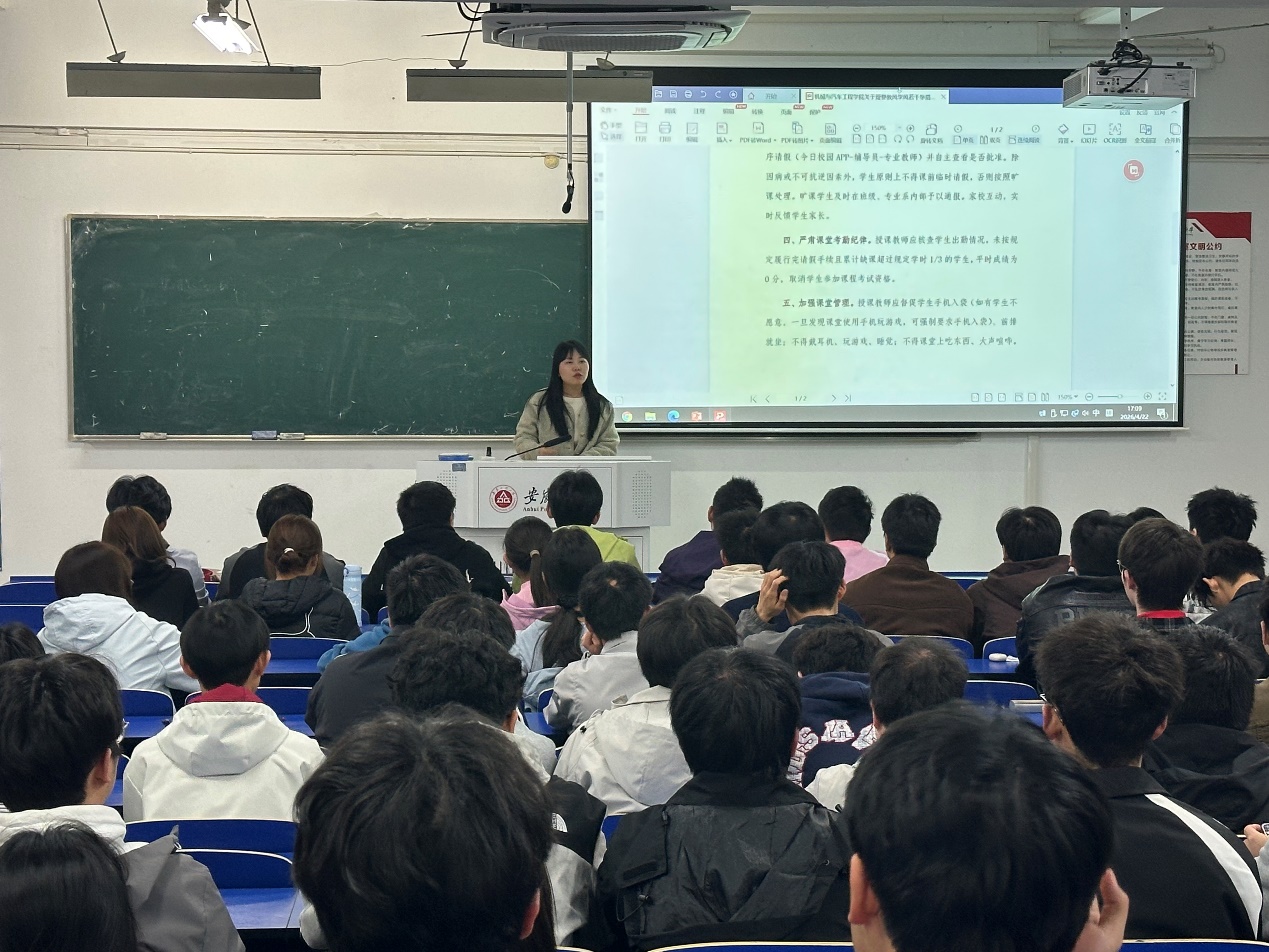 秦广虎传达了学校关于进一步加强学风建设的文件精神,并通报了学院近期学风建设督查情况。他表示,当前学院整体学风态势向好,但仍存在课堂出勤、晚自习纪律、学业预警等方面的薄弱环节;领学《Bl小说 关于改进教风学风的若干举措》并从生涯教育、考勤制度、课堂行为规范、学业帮扶机制、教师授课、全员育人等方面进行了详细解读;希望各班级要组织专题学习,确保每位学生知晓并遵守。